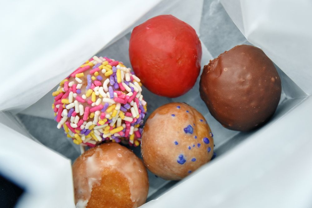 An assortment of donut holes covered with chocolate, cherry, blueberry, glaze or sprinkles.